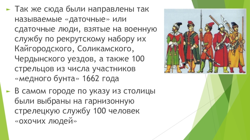 взятые на военную службу по рекрутскому набору их Кайгородского, Соликамского, Чердынского уездов, а также 100 стрельцов из числа участников «медного бунта» 1662 года