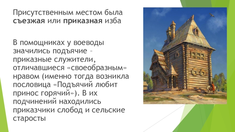 Слайд 13Присутственным местом была съезжая или приказная изба