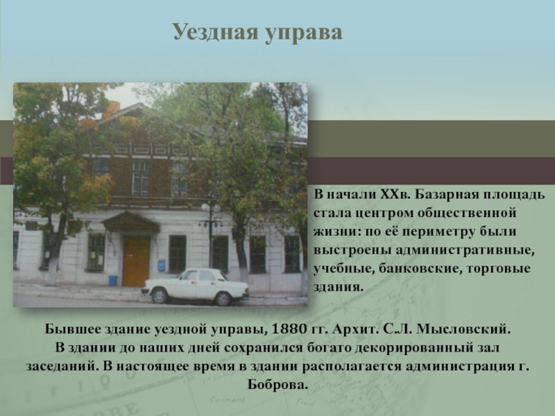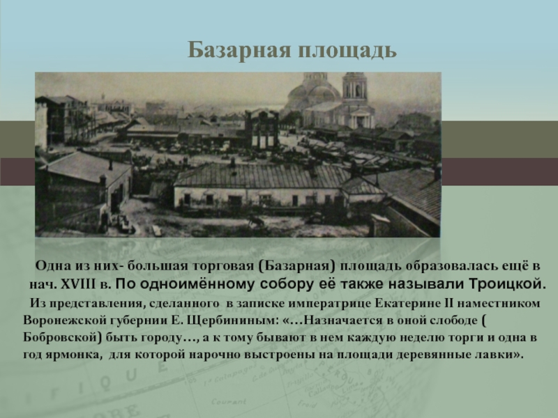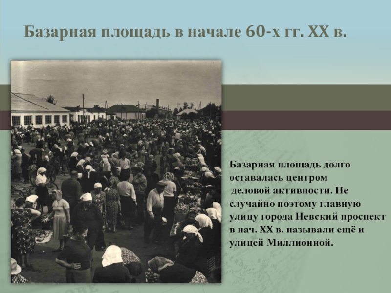 В начали XXв. Базарная площадь стала центром общественной жизни: по её периметру были выстроены административные, учебные, банковские, торговые здания.
