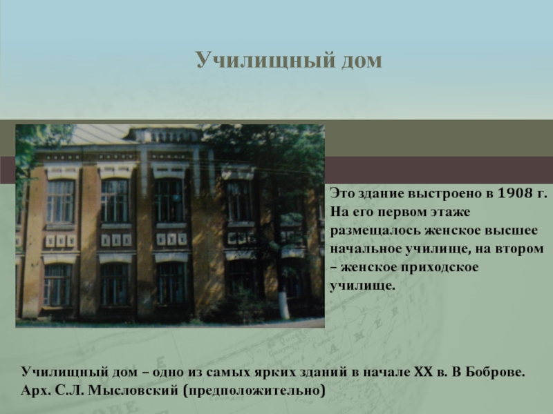 Училищный дом – одно из самых ярких зданий в начале XX в. В Боброве. Арх. С.Л. Мысловский (предположительно)