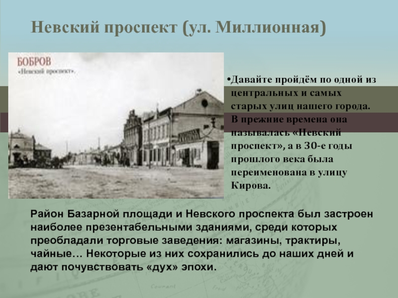 Давайте пройдём по одной из центральных и самых старых улиц нашего города. В прежние времена она называлась «Невский проспект», а в 30-е годы прошлого века была переименована в улицу Кирова.
