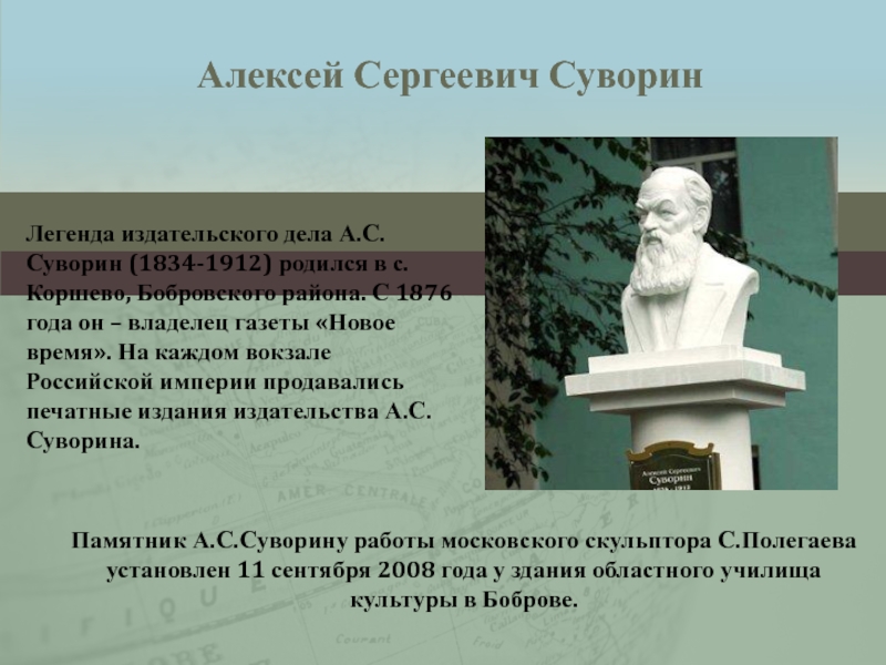 Легенда издательского дела А.С.Суворин (1834-1912) родился в с. Коршево, Бобровского района. С 1876 года он – владелец газеты «Новое время». На каждом вокзале Российской империи продавались печатные издания издательства А.С.Суворина.