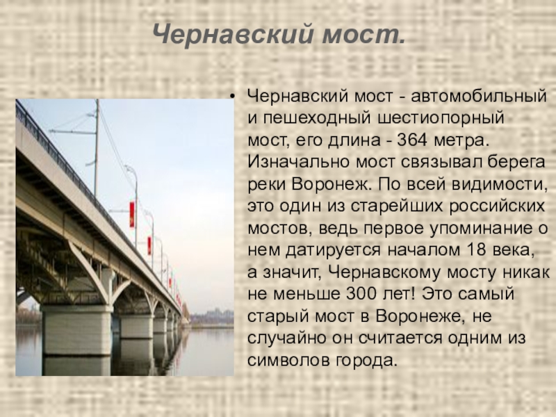 - 364 метра. Изначально мост связывал берега реки Воронеж. По всей видимости, это один из старейших российских мостов, ведь первое упоминание о нем датируется началом 18 века, а значит, Чернавскому мосту никак не меньше 300 лет! Это самый старый мост в Воронеже, не случайно он считается одним из символов города.