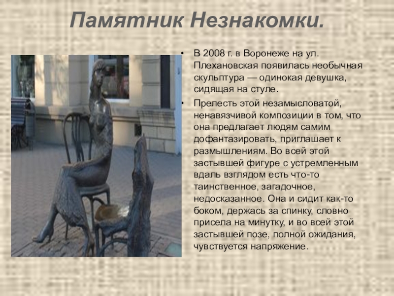 Прелесть этой незамысловатой, ненавязчивой композиции в том, что она предлагает людям самим дофантазировать, приглашает к размышлениям. Во всей этой застывшей фигуре с устремленным вдаль взглядом есть что-то таинственное, загадочное, недосказанное. Она и сидит как-то боком, держась за спинку, словно присела на минутку, и во всей этой застывшей позе, полной ожидания, чувствуется напряжение.