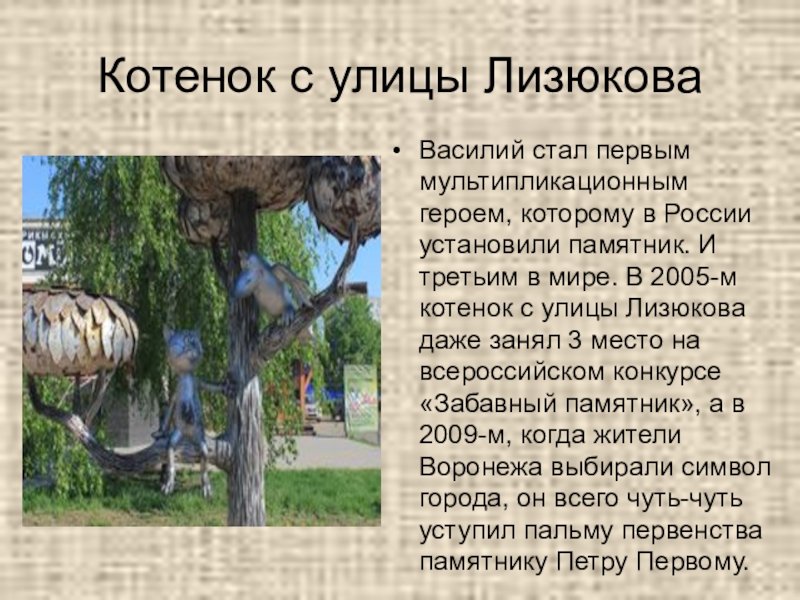 установили памятник. И третьим в мире. В 2005-м котенок с улицы Лизюкова даже занял 3 место на всероссийском конкурсе «Забавный памятник», а в 2009-м, когда жители Воронежа выбирали символ города, он всего чуть-чуть уступил пальму первенства памятнику Петру Первому.