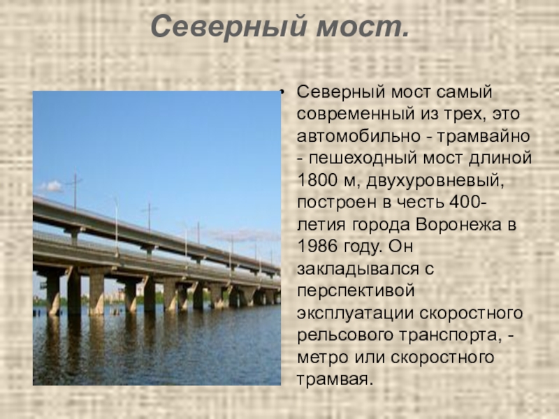 - пешеходный мост длиной 1800 м, двухуровневый, построен в честь 400-летия города Воронежа в 1986 году. Он закладывался с перспективой эксплуатации скоростного рельсового транспорта, - метро или скоростного трамвая.
