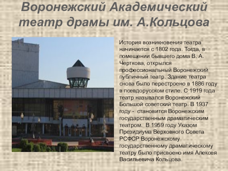 Слайд 4Воронежский Академический театр драмы им. А.Кольцова