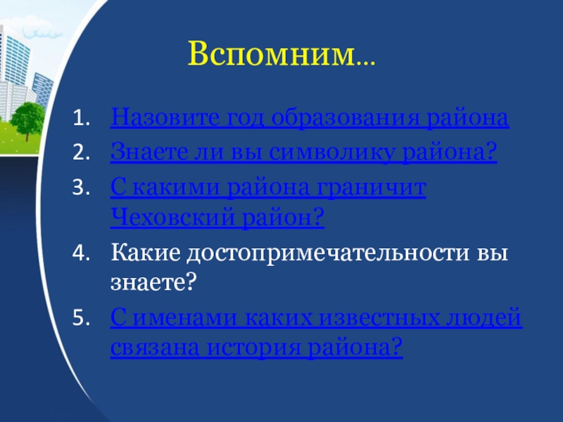 Вспомним…Назовите год образования районаЗнаете ли вы символику района?С какими района граничит Чеховский район?Какие достопримечательности вы знаете?С именами