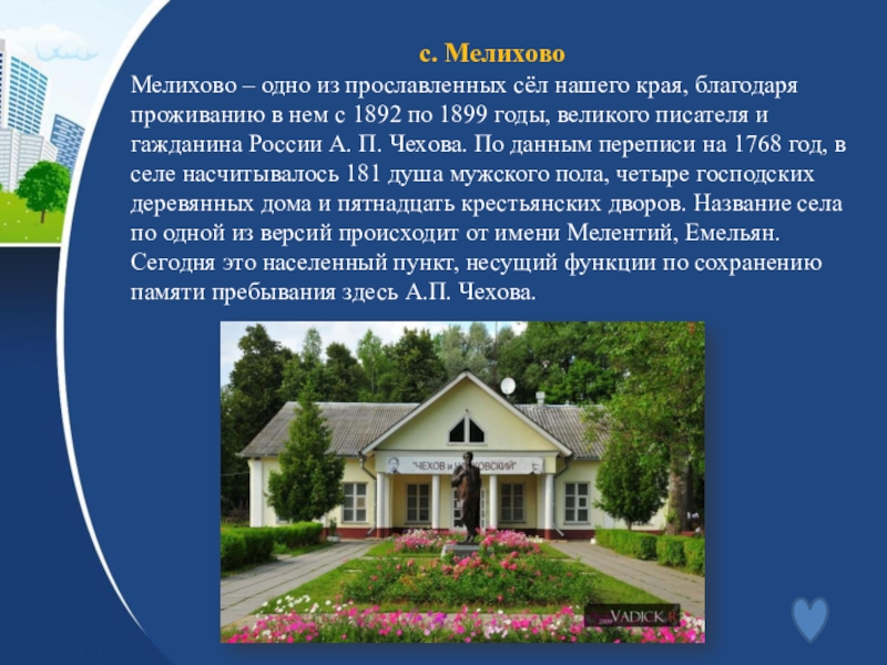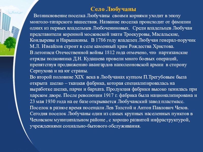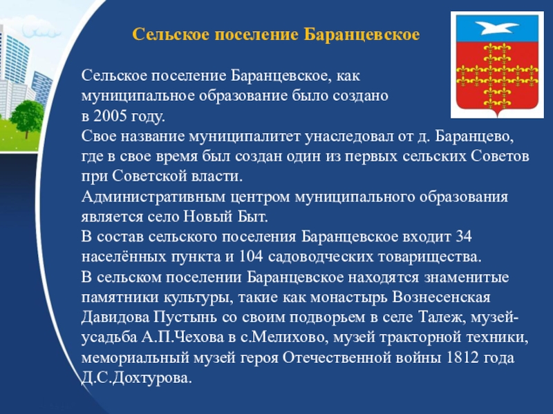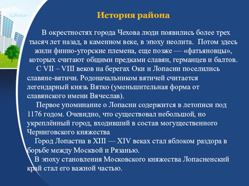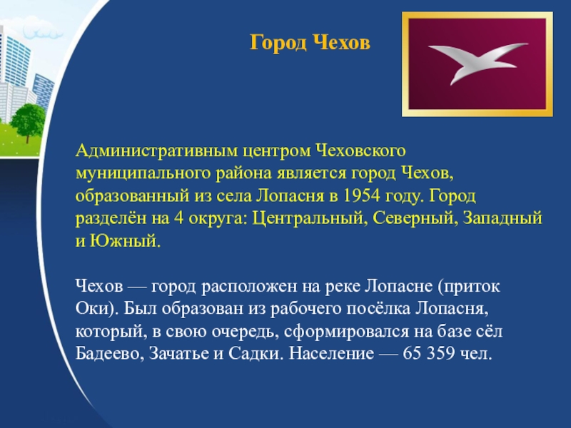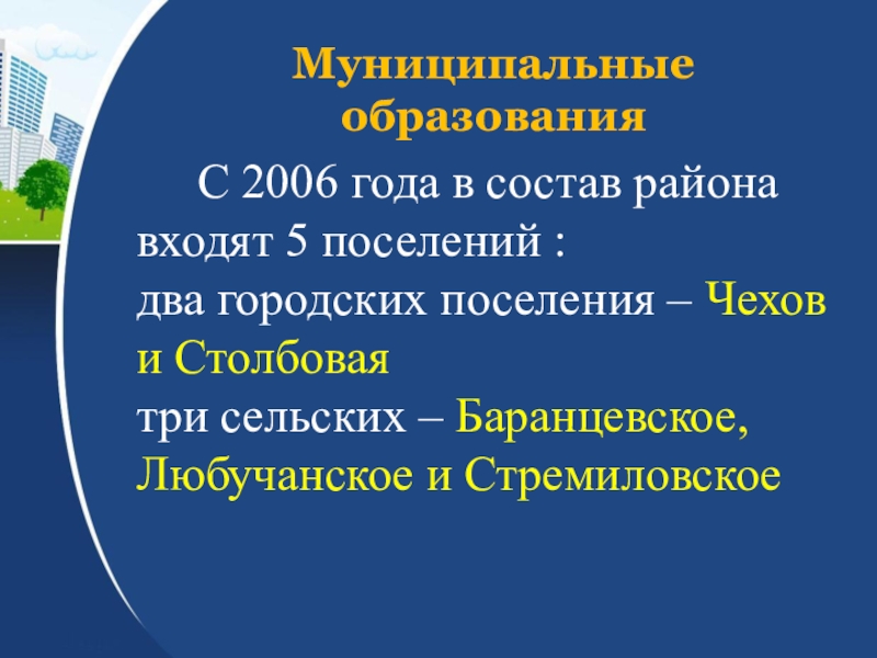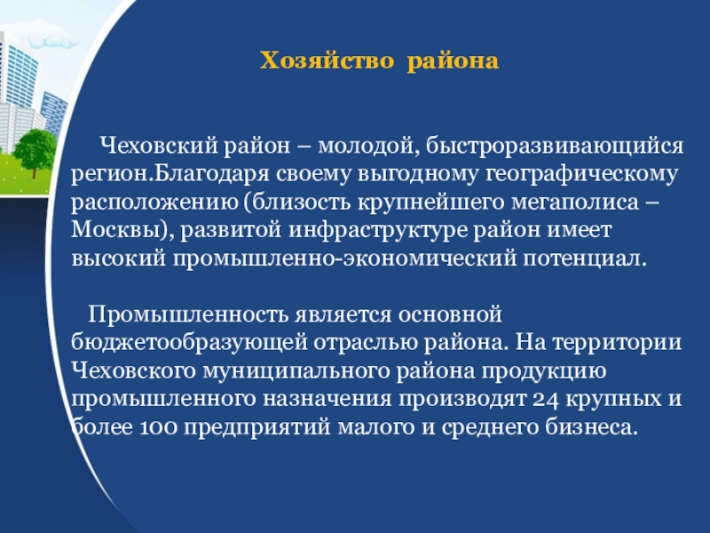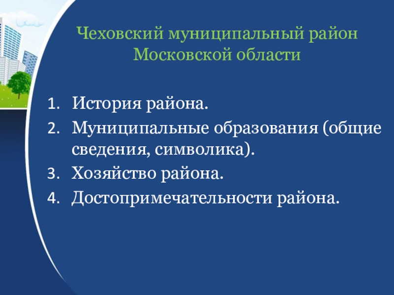 Чеховский муниципальный район Московской областиИстория района. Муниципальные образования (общие сведения, символика).Хозяйство района.Достопримечательности района.