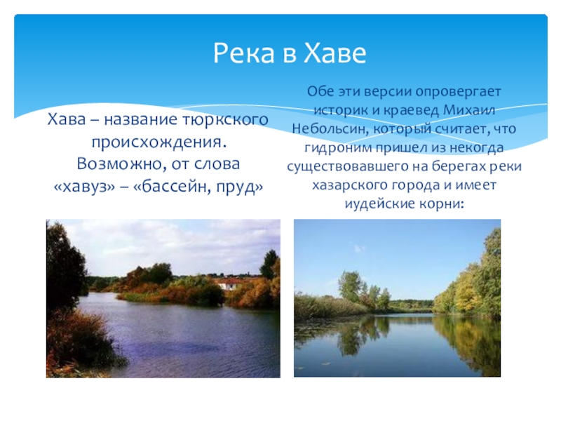 Обе эти версии опровергает историк и краевед Михаил Небольсин, который считает, что гидроним пришел из некогда существовавшего на берегах реки хазарского города и имеет иудейские корни:
