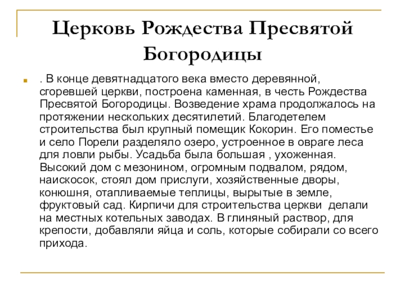 сгоревшей церкви, построена каменная, в честь Рождества Пресвятой Богородицы. Возведение храма продолжалось на протяжении нескольких десятилетий. Благодетелем строительства был крупный помещик Кокорин. Его поместье и село Порели разделяло озеро, устроенное в овраге леса для ловли рыбы. Усадьба была большая , ухоженная. Высокий дом с мезонином, огромным подвалом, рядом, наискосок, стоял дом прислуги, хозяйственные дворы, конюшня, отапливаемые теплицы, вырытые в земле, фруктовый сад. Кирпичи для строительства церкви делали на местных котельных заводах. В глиняный раствор, для крепости, добавляли яйца и соль, которые собирали со всего прихода.