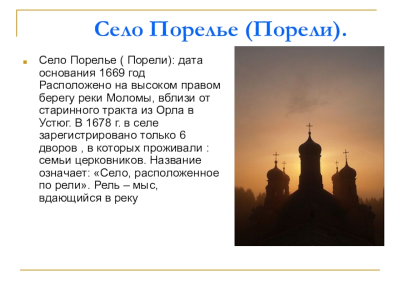 Порели): дата основания 1669 год Расположено на высоком правом берегу реки Моломы, вблизи от старинного тракта из Орла в Устюг. В 1678 г. в селе зарегистрировано только 6 дворов , в которых проживали : семьи церковников. Название означает: «Село, расположенное по рели». Рель – мыс, вдающийся в реку