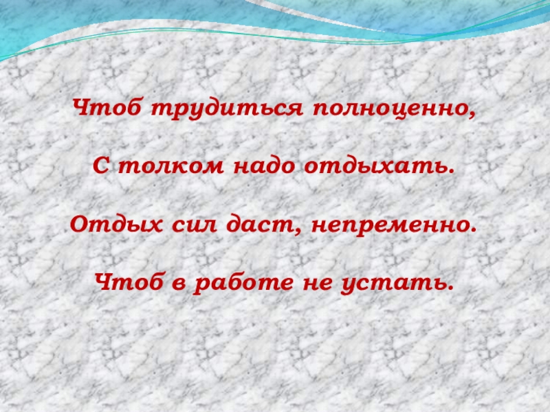 Чтоб трудиться полноценно, С толком надо отдыхать. Отдых сил даст, непременно. Чтоб в работе не устать.