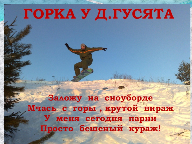 горка у д.ГусятаЗаложу  на  сноуборде Мчась  с  горы , крутой  вираж У  меня  сегодня  парни Просто  бешеный