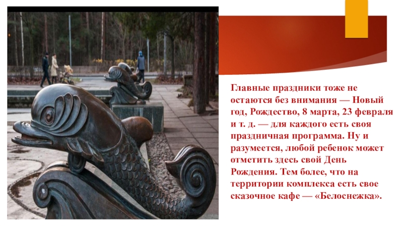 8 марта, 23 февраля и т. д. — для каждого есть своя праздничная программа. Ну и разумеется, любой ребенок может отметить здесь свой День Рождения. Тем более, что на территории комплекса есть свое сказочное кафе — «Белоснежка».