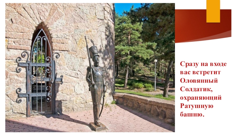 Слайд 3Сразу на входе вас встретит Оловянный Солдатик, охраняющий Ратушную башню.