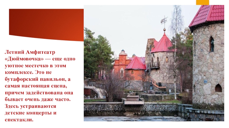 Слайд 6Летний Амфитеатр «Дюймовочка» — еще одно уютное местечко в этом комплексе.