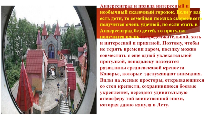 есть дети, то семейная поездка скорее всего получится очень удачной, но если ехать в Андерсенград без детей, то прогулка получится очень непродолжительной, хоть и интересной и приятной. Поэтому, чтобы не терять времени даром, поездку можно совместить с еще одной увлекательной прогулкой, неподалеку находятся развалины средневековой крепости Копорье, которые заслуживают внимания. Виды на лесные просторы, открывающиеся со стен крепости, сохранившиеся боевые укрепления, передают удивительную атмосферу той воинственной эпохи, которая давно канула в Лету.