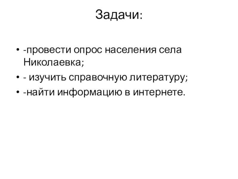 Задачи: -провести опрос населения села Николаевка;- изучить справочную литературу;-найти информацию в интернете.