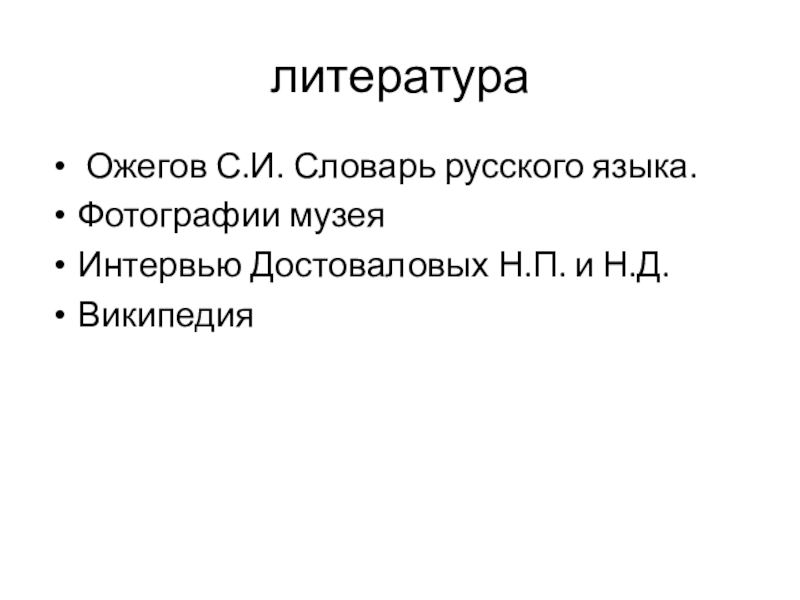 литература Ожегов С.И. Словарь русского языка.Фотографии музеяИнтервью Достоваловых Н.П. и Н.Д.Википедия