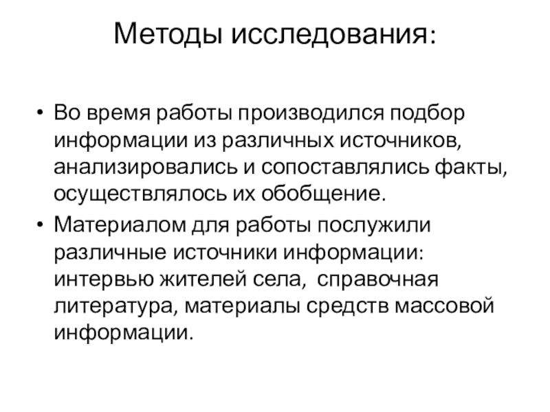Материалом для работы послужили различные источники информации: интервью жителей села, справочная литература, материалы средств массовой информации.