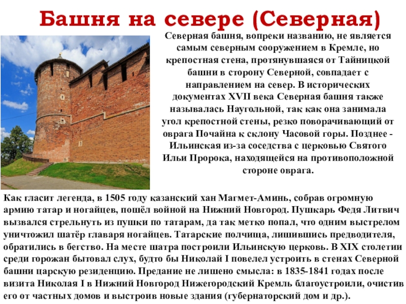 Как гласит легенда, в 1505 году казанский хан Магмет-Аминь, собрав огромную армию татар и ногайцев, пошёл войной на Нижний Новгород. Пушкарь Федя Литвич вызвался стрельнуть из пушки по татарам, да так метко попал, что одним выстрелом уничтожил шатёр главаря ногайцев. Татарские полчища, лишившись предводителя, обратились в бегство. На месте шатра построили Ильинскую церковь. В XIX столетии среди горожан бытовал слух, будто бы Николай I повелел устроить в стенах Северной башни царскую резиденцию. Предание не лишено смысла: в 1835-1841 годах после визита Николая I в Нижний Новгород Нижегородский Кремль благоустроили, очистив его от частных домов и выстроив новые здания (губернаторский дом и др.).