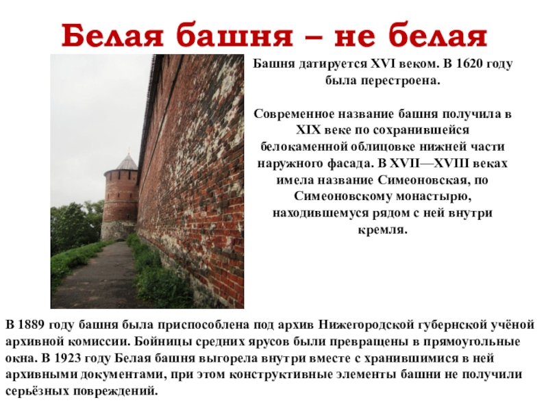 В 1889 году башня была приспособлена под архив Нижегородской губернской учёной архивной комиссии. Бойницы средних ярусов были превращены в прямоугольные окна. В 1923 году Белая башня выгорела внутри вместе с хранившимися в ней архивными документами, при этом конструктивные элементы башни не получили серьёзных повреждений.