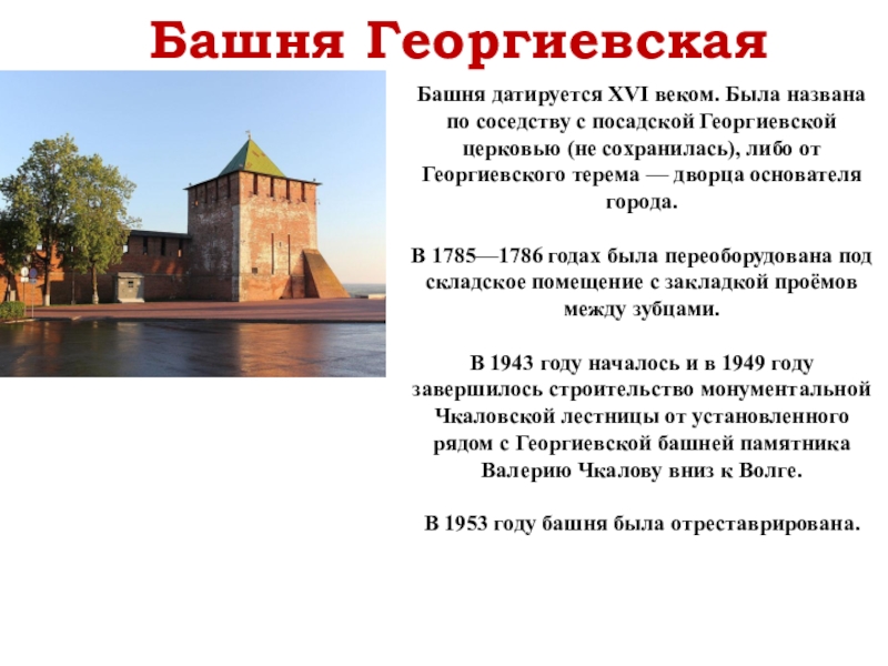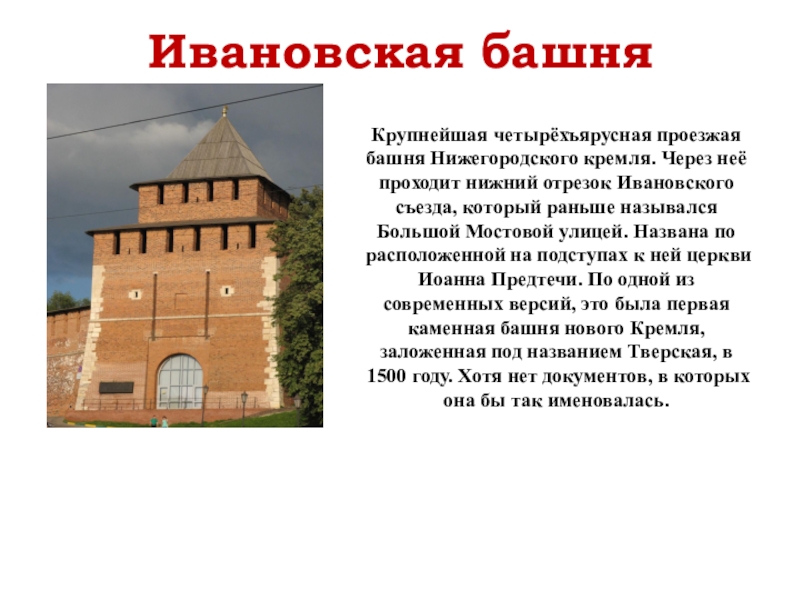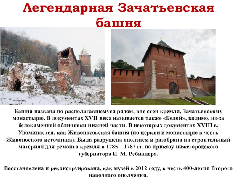 В башнях Нижегородского Кремля, выстроенных по косогору до Почайны (Никольской, Коромысловой, Тайницкой), размещались хранилища с порохом, а в самом овраге находился завод с ветряной мельницей — Зелейный двор.
