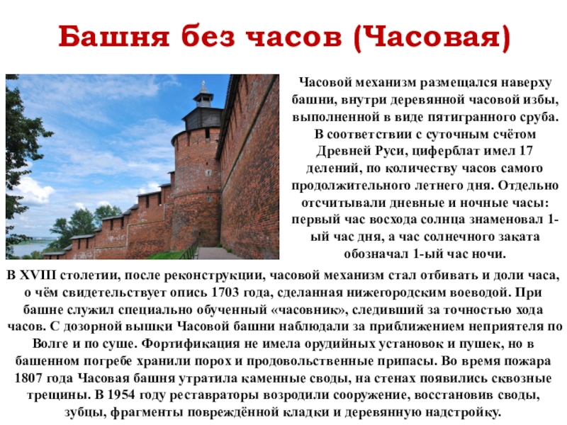 Часовой механизм размещался наверху башни, внутри деревянной часовой избы, выполненной в виде пятигранного сруба. В соответствии с суточным счётом Древней Руси, циферблат имел 17 делений, по количеству часов самого продолжительного летнего дня. Отдельно отсчитывали дневные и ночные часы: первый час восхода солнца знаменовал 1-ый час дня, а час солнечного заката обозначал 1-ый час ночи.