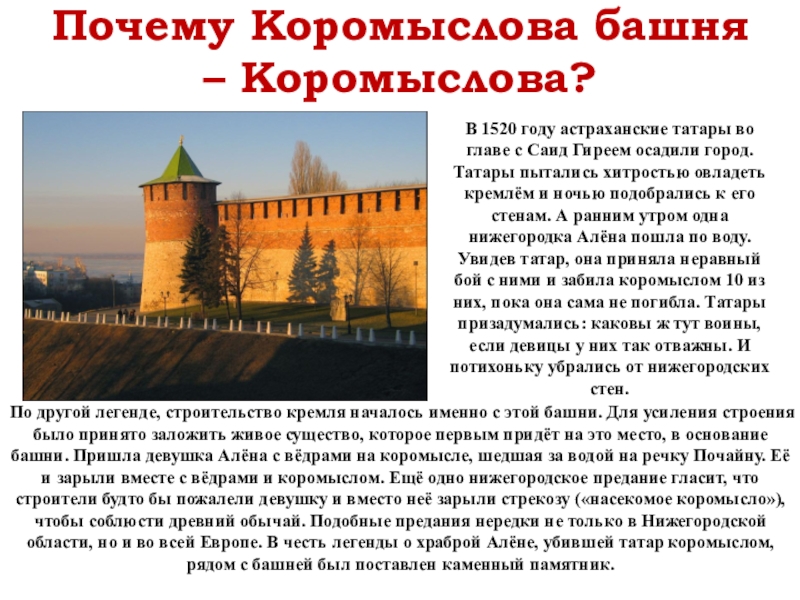 По другой легенде, строительство кремля началось именно с этой башни. Для усиления строения было принято заложить живое существо, которое первым придёт на это место, в основание башни. Пришла девушка Алёна с вёдрами на коромысле, шедшая за водой на речку Почайну. Её и зарыли вместе с вёдрами и коромыслом. Ещё одно нижегородское предание гласит, что строители будто бы пожалели девушку и вместо неё зарыли стрекозу («насекомое коромысло»), чтобы соблюсти древний обычай. Подобные предания нередки не только в Нижегородской области, но и во всей Европе. В честь легенды о храброй Алёне, убившей татар коромыслом, рядом с башней был поставлен каменный памятник.