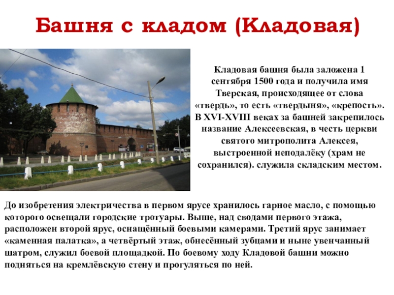 До изобретения электричества в первом ярусе хранилось гарное масло, с помощью которого освещали городские тротуары. Выше, над сводами первого этажа, расположен второй ярус, оснащённый боевыми камерами. Третий ярус занимает «каменная палатка», а четвёртый этаж, обнесённый зубцами и ныне увенчанный шатром, служил боевой площадкой. По боевому ходу Кладовой башни можно подняться на кремлёвскую стену и прогуляться по ней.