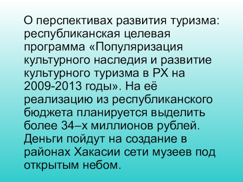 Слайд 27 О перспективах развития туризма: республиканская целевая программа «Популяризация культурного