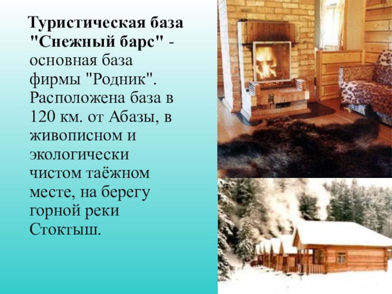 Слайд 13 Туристическая база "Снежный барс" - основная база фирмы "Родник".