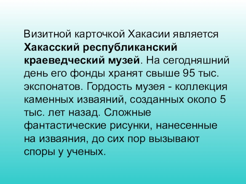Визитной карточкой Хакасии является Хакасский республиканский краеведческий музей. На сегодняшний день его фонды хранят