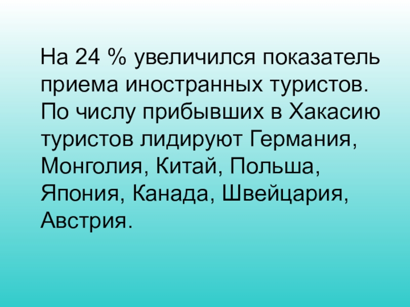 Слайд 10 На 24 % увеличился показатель приема иностранных туристов. По