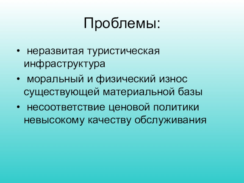 Проблемы: неразвитая туристическая инфраструктура моральный и физический износ существующей материальной базы несоответствие ценовой политики невысокому качеству обслуживания