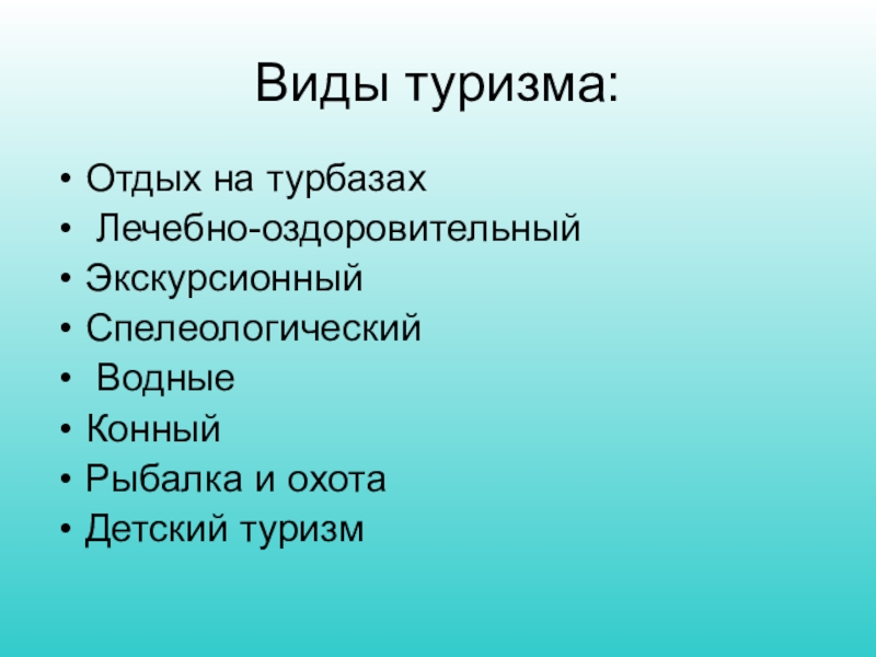 Виды туризма:Отдых на турбазах Лечебно-оздоровительныйЭкскурсионныйСпелеологический ВодныеКонныйРыбалка и охотаДетский туризм