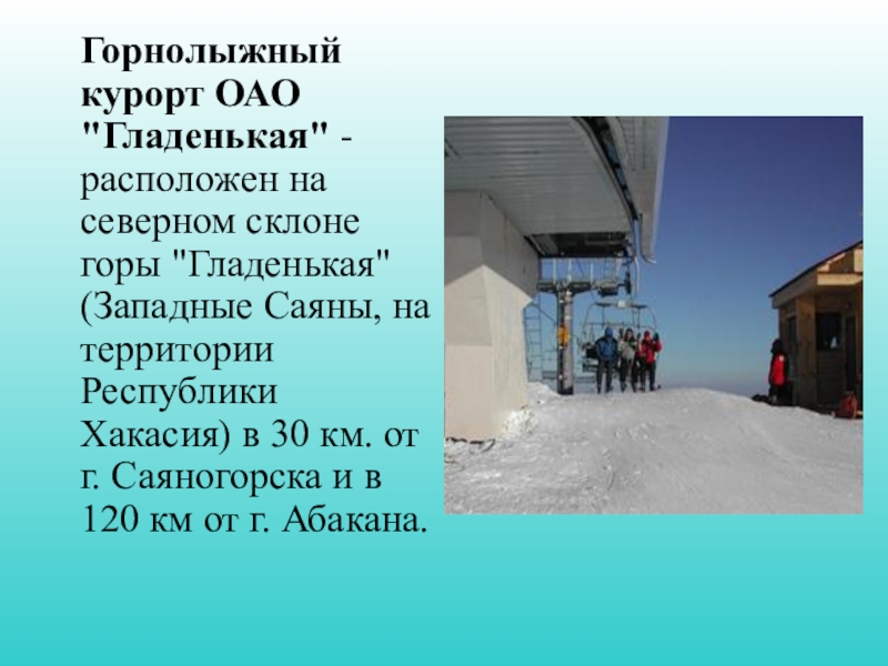 Слайд 15 Горнолыжный курорт ОАО "Гладенькая" - расположен на северном склоне