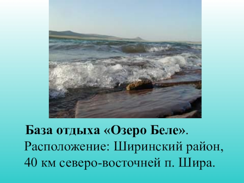 Слайд 24 База отдыха «Озеро Беле». Расположение: Ширинский район, 40 км