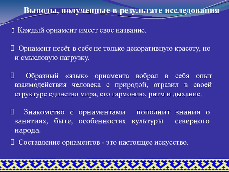 Назначение орнамента – украсить поверхность предмета, изделия, сделать его более красивым и оригинальным, передать через орнамент информацию о мастерице, о месте ее проживания, роду занятий, о ее семье, показать её мастерство и творчество.