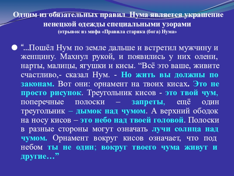 “…Пошёл Нум по земле дальше и встретил мужчину и женщину. Махнул рукой, и появились у них олени, нарты, малицы, ягушки и кисы. “Всё это ваше, живите счастливо,- сказал Нум. - Но жить вы должны по законам. Вот они: орнамент на твоих кисах. Это не просто рисунок. Треугольник кисов - это твой чум, поперечные полоски – запреты, ещё один треугольник – дымок над чумом. А верхний ободок на носу кисов – это небо над твоей головой. Полоски в разные стороны могут означать лучи солнца над чумом. Орнамент вокруг кисов означает, что под небом ты не один; вокруг твоего чума живут и другие…”