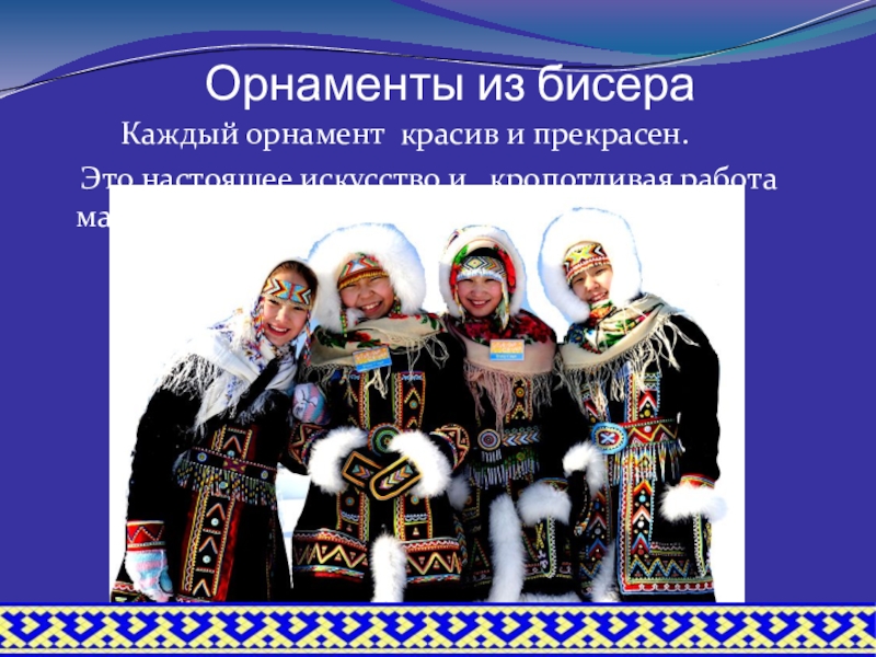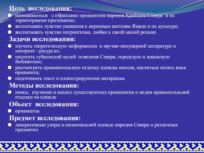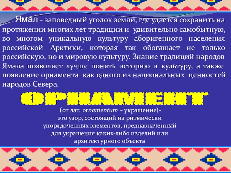 Ямал - заповедный уголок земли, где удается сохранить на протяжении многих лет традиции и удивительно самобытную, во многом уникальную культуру аборигенного населения российской Арктики, которая так обогащает не только российскую, но и мировую культуру. Знание традиций народов Ямала позволяет лучше понять историю и культуру, а также появление орнамента как одного из национальных ценностей народов Севера.