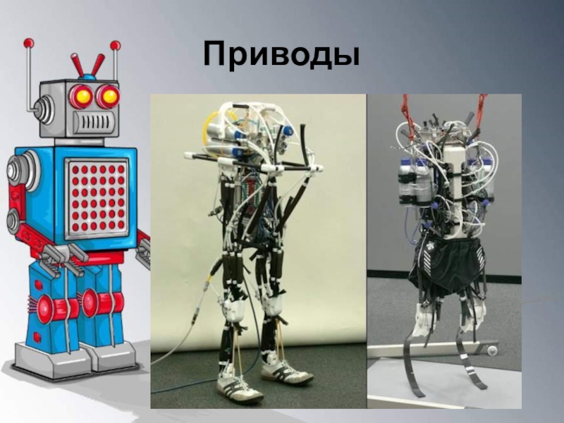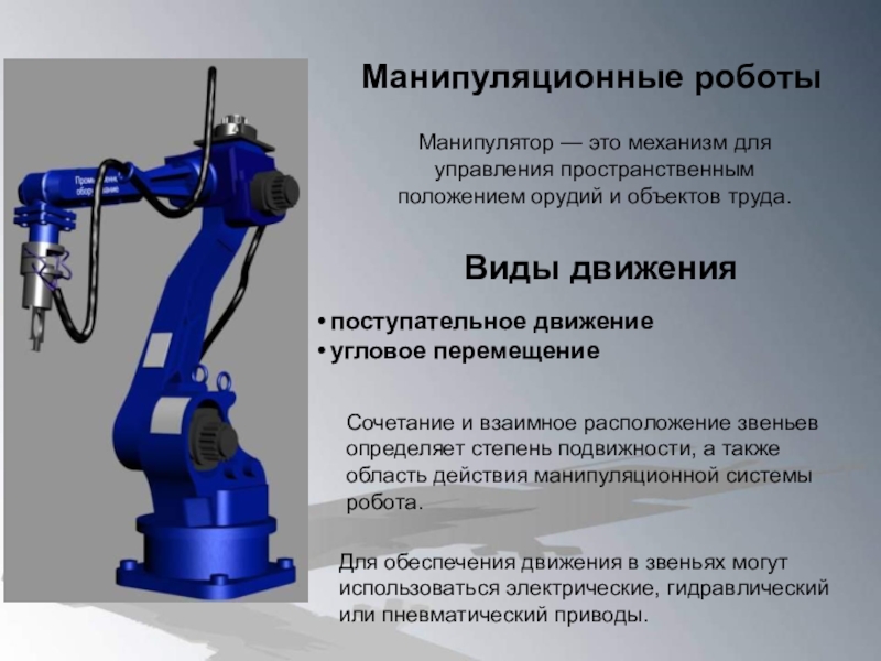 Для обеспечения движения в звеньях могут использоваться электрические, гидравлический или пневматический приводы.