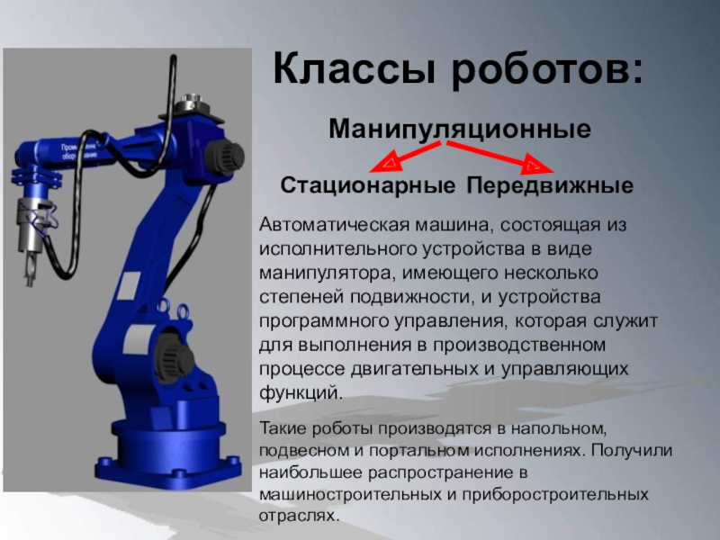 Такие роботы производятся в напольном, подвесном и портальном исполнениях. Получили наибольшее распространение в машиностроительных и приборостроительных отраслях.