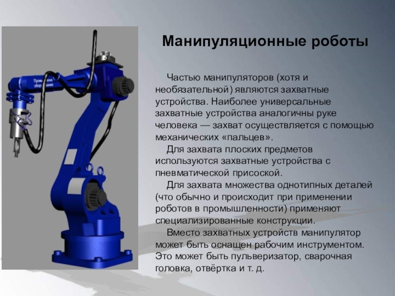 Сочетание и взаимное расположение звеньев определяет степень подвижности, а также область действия манипуляционной системы робота.