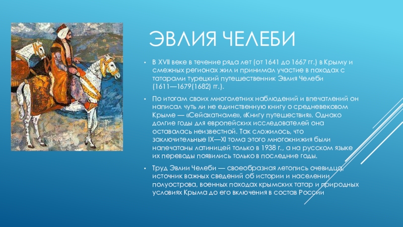 Труд Эвлии Челеби — своеобразная летопись очевидца, источник важных сведений об истории и населении полуострова, военных походах крымских татар и природных условиях Крыма до его включения в состав России