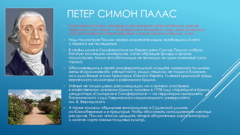 – Петербургской Академии наук, действительный статский советник Петр Семенович Паллас прожил в Крыму 15 лет.