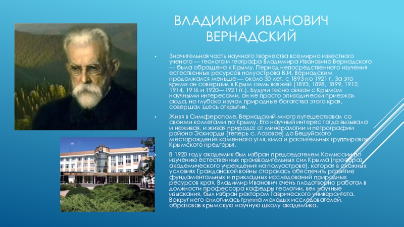и географа Владимира Ивановича Вернадского — была обращена к Крыму. Период непосредственного изучения естественных ресурсов полуострова В.И. Вернадским продолжался меньше — около 30 лет, с 1893 по 1921 г. За это время он совершил в Крым семь вояжей (1893, 1898, 1899, 1912, 1914, 1916 и 1920—1921 гг.). Будучи тесно связан с Крымом научными интересами, он не просто эпизодически приезжал сюда, но глубоко изучал природные богатства этого края, совершал здесь открытия.