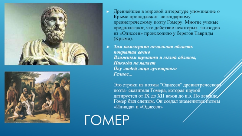 Гомеру. Многие ученые предполагают, что действие некоторых эпизодов из «Одиссеи» происходило у берегов Тавриды (Крыма).