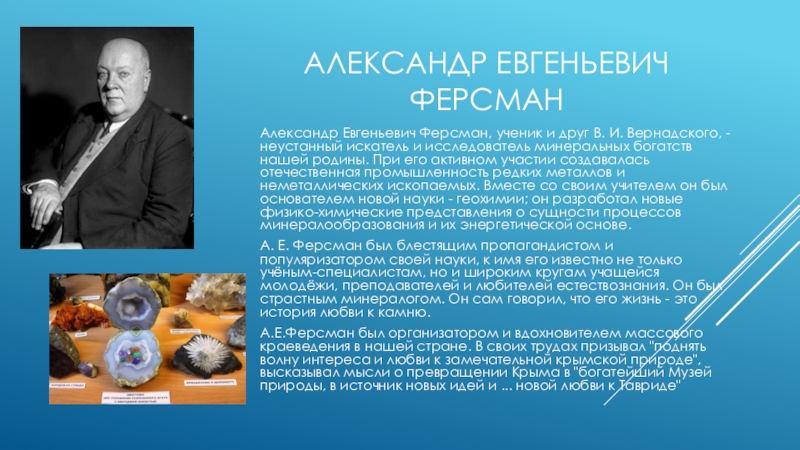 Слайд 11Александр Евгеньевич Ферсман, ученик и друг В. И. Вернадского, - неустанный